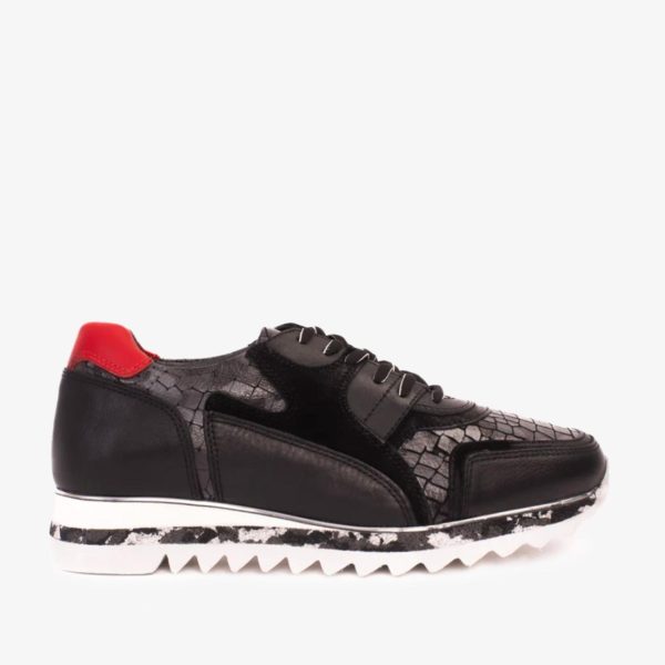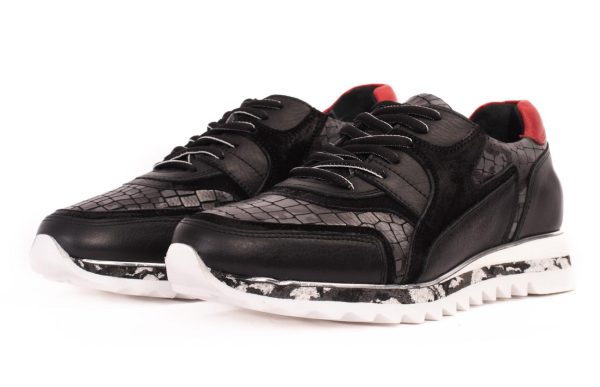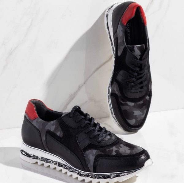 Step into a realm of exceptional craftsmanship and contemporary elegance with the Cakarta Black Leather Men Sneaker – where the marriage of camouflage print, red accents, and silver Details
