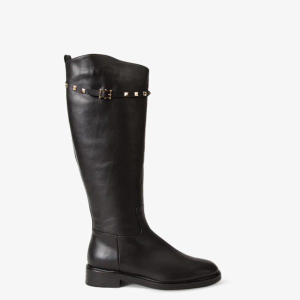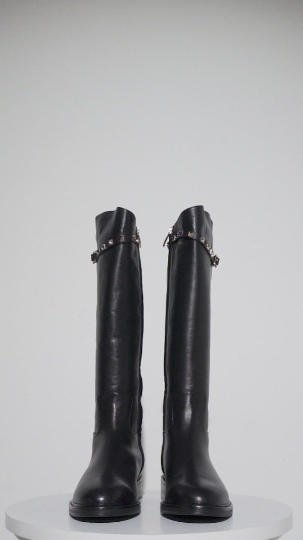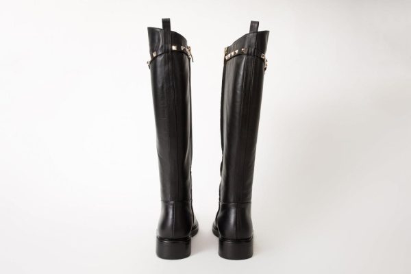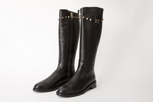 The calf area of the boot features a leather buckle adorned with gold spikes.